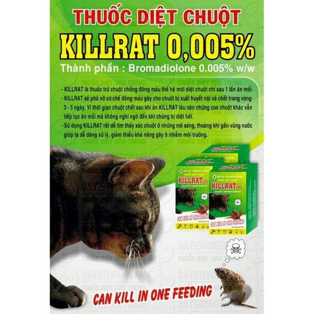Killrat là chế phẩm của hãng EARTH CHEMICAL CHINA. Thành phần của thuốc có 0,005% bromadiolone – Đây là dẫn xuất của dicoumarol có vai trò chống đông máu.