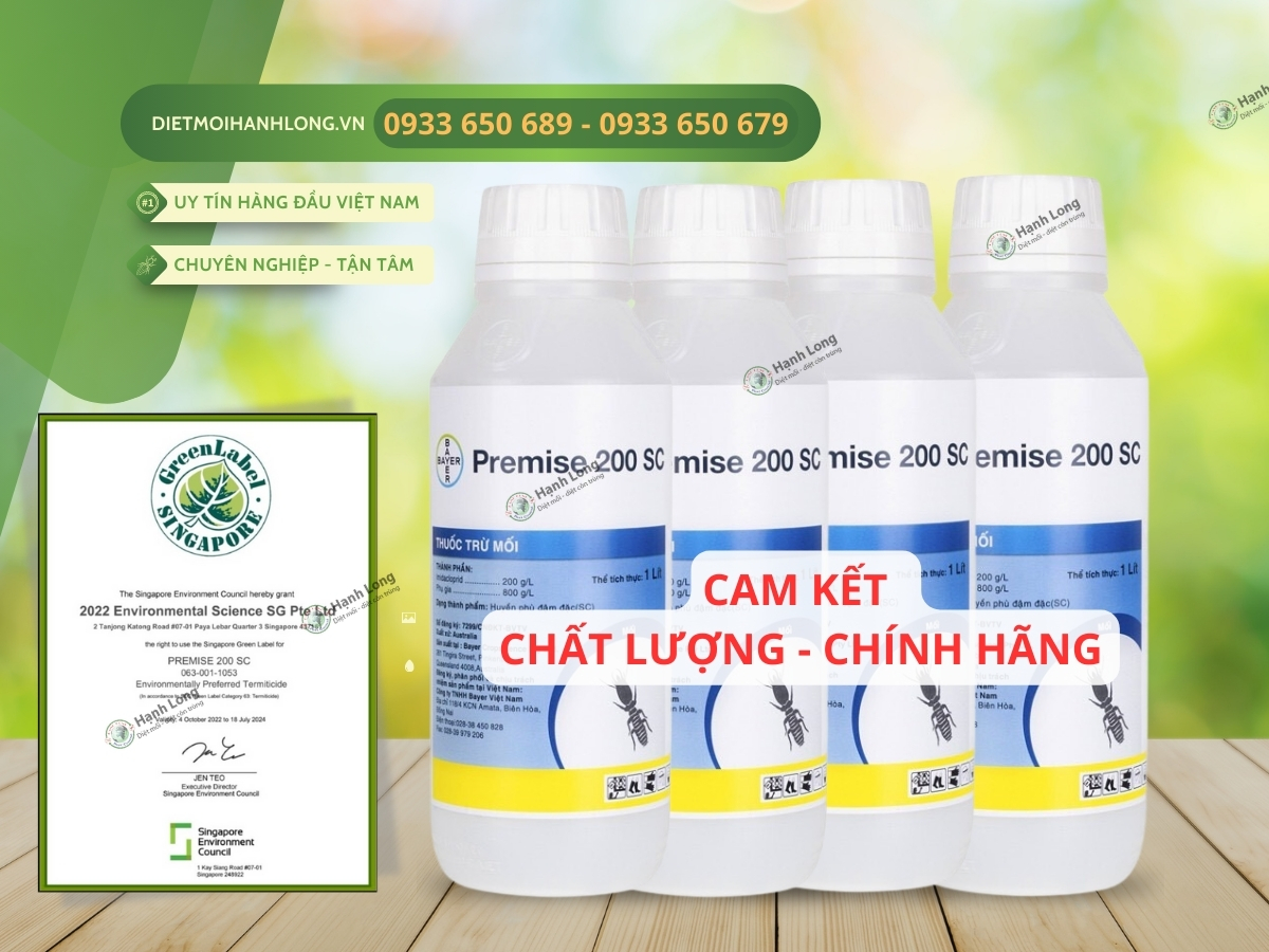 Diệt mối Hạnh Long cam kết cung cấp thuốc trừ mối Premise 200SC chính hãng, từ Bayer, có đầy đủ giấy chứng nhận xuất xứ (CO) và chất lượng (CQ). Bạn có thể hoàn toàn yên tâm về nguồn gốc, chất lượng và hạn sử dụng của sản phẩm.